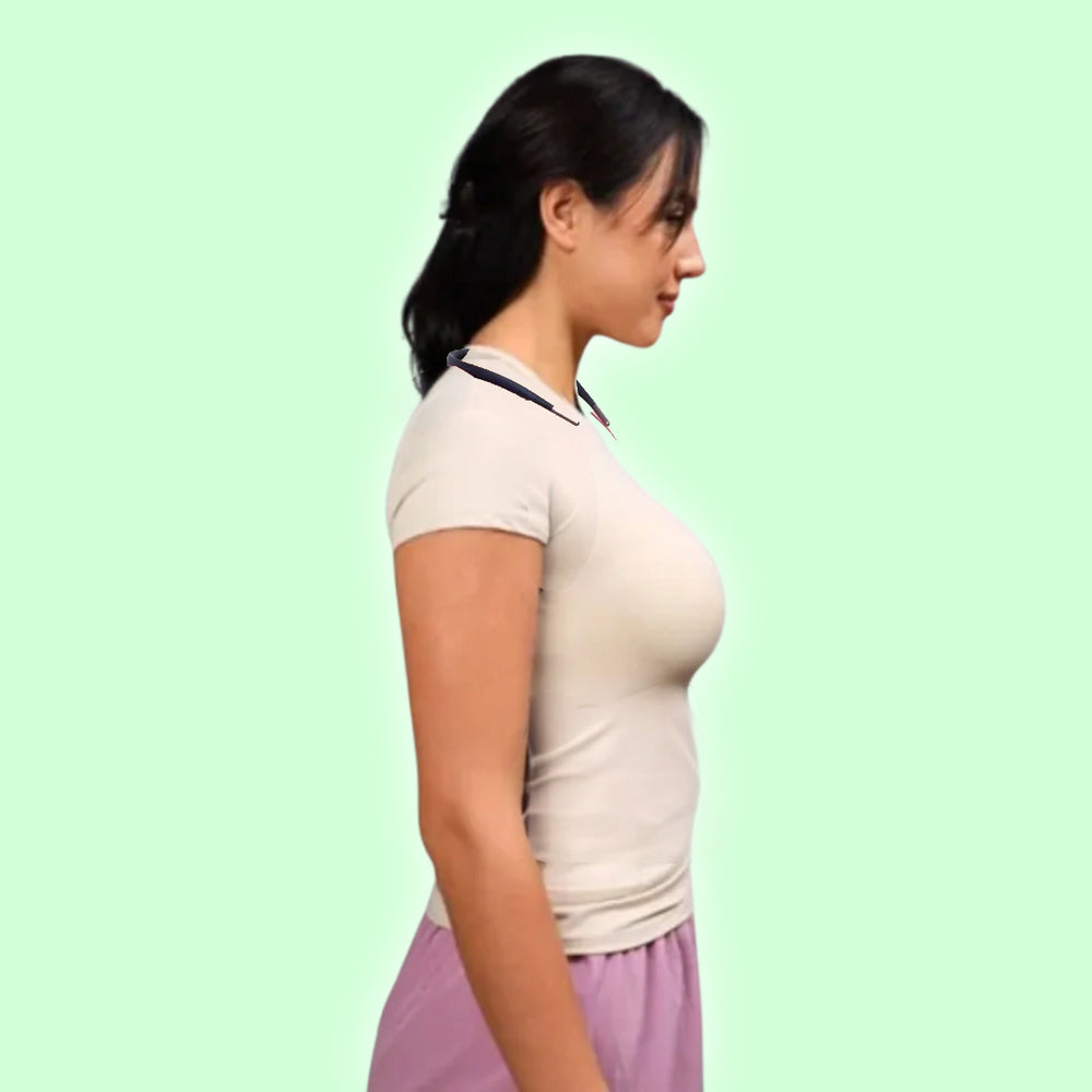 Der KI-Haltungskorrektor legt sich sanft um Ihren Nacken und bleibt unter Ihrer Kleidung völlig unsichtbar.