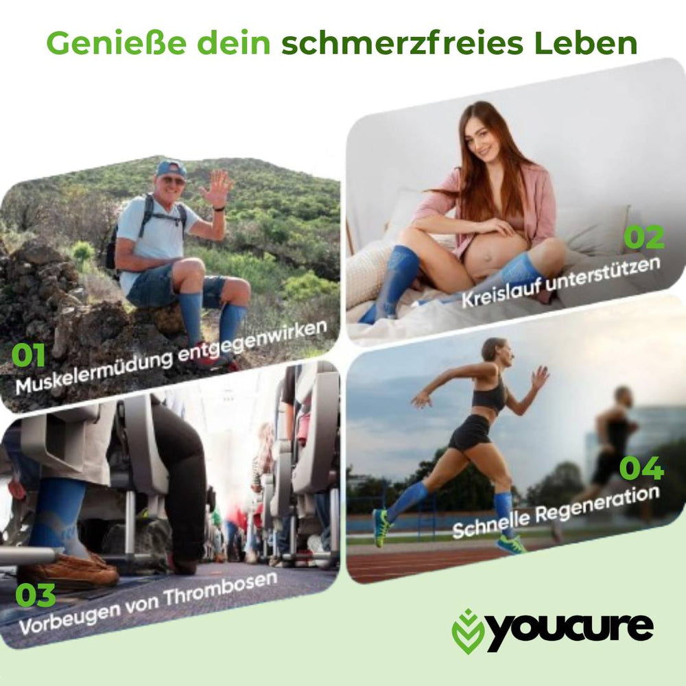 Die Kompressionsstrümpfe von YouCure fördern die Durchblutung, reduzieren Schwellungen und lindern das Schweregefühl. Perfekt nach einem langen Tag im Stehen oder Sitzen.